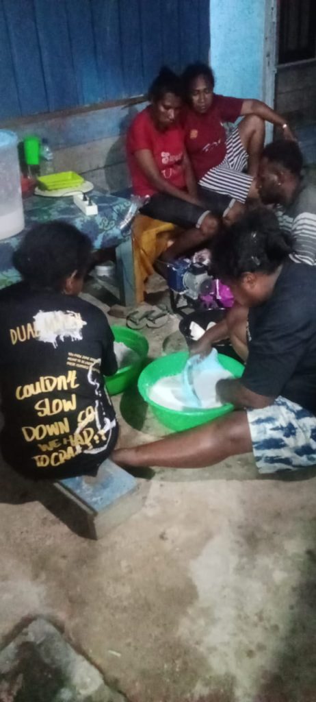 Throughout this collaborative learning process, both communities took the opportunity to introduce their respective customs and positive traditional practices. The Fyarkin community showcased various natural potentials and indigenous knowledge, such as the tradition of producing organic fertiliser, as well as the processing and production of virgin coconut oil (VCO) from coconuts. One particularly engaging activity was the planting of sweet potato seedlings (petatas) from Numfor Island in the Paia community’s group garden.